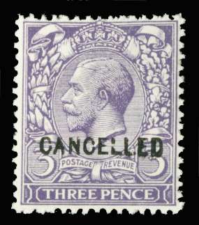 1912-24 3d Violet (Wmk. Royal cypher). Very fine unmounted o.g example overprinted "CANCELLED" type 24. Scarce. Spec. N22u.