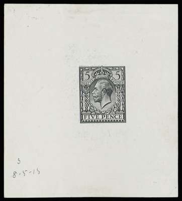 1913 5d Die proof. Very fine almost fully cleared example printed in black on white glazed card (71 x 78mm), dated in manuscript "8-5-13" and numbered "249" on reverse. Most attractive and rare. SG 381var, £6,500.