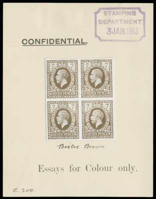 1913 7d Eve's Wreath design colour essays. Very fine ungummed imperforate block of four essays (Fig 30a) in bistre brown on white unwatermarked card mounted on thick card (88 x 113mm). Showing "CONFIDENTIAL" and "Essays for Colour only"ink manuscript "Bistre Brown" below the stamps and "E200" at lower left, purple "STAMPING DEPARTMENT/3 JAN. 1913." handstamp at top right. Most attractive and rare. SG 387var, £8,750.