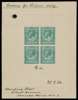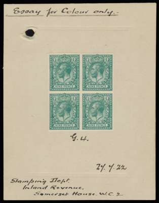 1922 9d Olive-green colour trials. A superb unused o.g. imperforate block of four printed in turquoise-blue on unwatermarked paper, mounted on thick card (95 x 123mm). Card endorsed in manuscript "Essay for Colour only" at top, "G.4., 27.7.22" and "Stamping Dept, Inland Revenue, Somerset House W.C.2" at foot. Extremely attractive and rare.