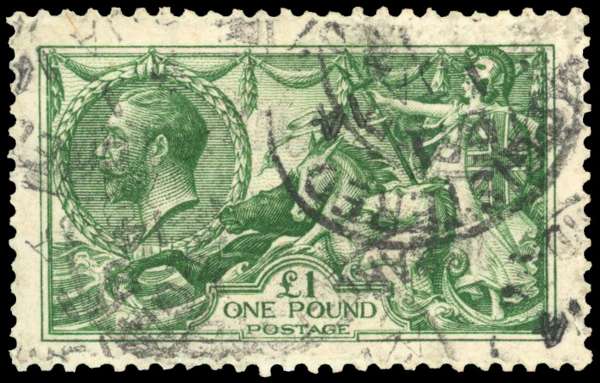 1913 £1 green, well centred, cancelled by indistinct cancels, a couple of shortish perfs still a representative example of this popular stamp, good used SG 403