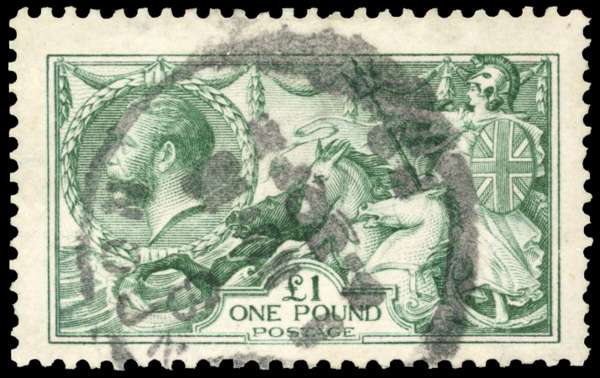 GB: 1913 £1 deep blue-green, centred to bottom, indistinct parcel cancel still a collectable used example. SG 404