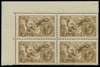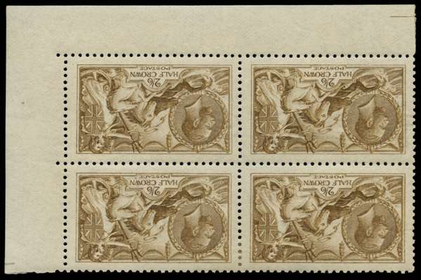 1915 2s6d Pale yellow-brown (Wmk. Inverted). Very fine and fresh unused o.g. bottom right hand corner marginal block of four printed by DLR. Top pair showing watermark inverted and bottom pair showing inverted "POST" of "POSTAGE" watermark. A wonderful multiple scarce so fine. Spec. N64(7)f/ya.