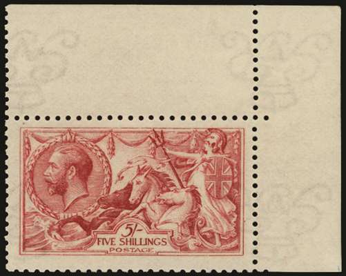 1915 5s Carmine (Wmk. Inverted). Very fine unmounted o.g. top right hand corner marginal example of this rare watermark variety printed by DLR. Spec. N67(2)b.
