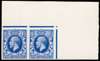 1934 1½d "Photogravure" essay. Very fine imperforate corner marginal pair printed on glazed, unwatermarked paper without gum in royal blue. Scarce.