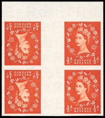 1955 ½d orange-red (Wmk. St Edward's Crown), superb unmounted o.g. imperforate top marginal tête-bêche gutter block of four imprimaturs with “BPMA” handstamps on reverse. Very scarce. SG 540var.