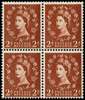 1958 2d Light red brown "Dollis Hill Phosphor Trial". Very fine perforated block of four on gummed crowns watermarked (upright) paper, with an all over green phosphor showing a strong phosphor reaction. Scarce. Spec. ST5(3)b.