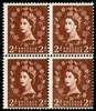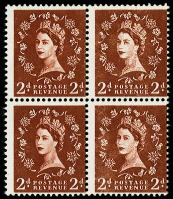 GB SG573var 1958 2d Red brown “Dollis Hill Phos Trial“. x 4.
