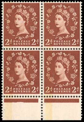 1959 2d light red-brown, one left phosphor band, ‘ERROR ST EDWARD’S COWN WATERMARK', lower marginal block of four