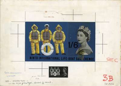 1963 Ninth International Lifeboat Conference 1s6d sepia, yellow, and grey-blue composite essay, designed by David Gentleman, on card (253x190mm) with colour swatches at left, in a similar design to the issued stamp (the colour of the inscription and value differs), the crew members and lifebuoy hand-painted and the portrait, inscription, and value stuck down with tape. Adorned with the artists notes in the surroundings and on the reverse with a photographic proof of the design with further notations attached to the ‘frame’. An attractive and unique essay. SG 641var.
