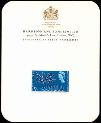 1964 9d Botanical congress. Very fine essay depicting ferns, printed in blue, lilac and black, perforated 15x14 on gummed unwatermarked paper, mounted on a Harrison & Sons presentation card. Typed on reverse "Design No.32c./4371". A very rare unique essay, ex Goaman archive.