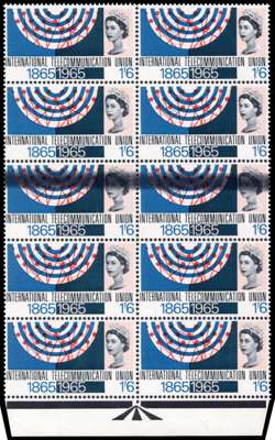 GB: 1965 1s6d ITU Centenary ordinary bottom marginal block of 10 (2x5) with pronounced doctor blade flaw in black across