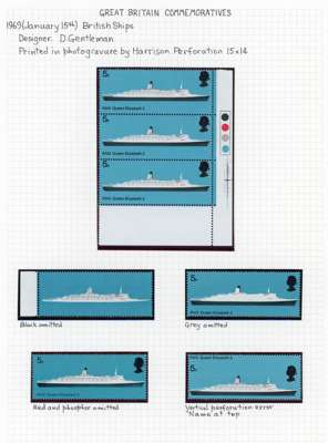 1969 British Ships QEII 5d black (Queen's head, value, hull and inscription) omitted, 5d grey (decks etc) omitted, 5d red and phosphor omitted and 5d vertical perforation shift causing inscription to appear at top versus bottom, a useful group, fine unmounted o.g. (7) SG btn 778/778ya