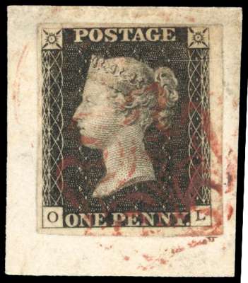 GB: 1840 1d black Plate 3 (OL) 4-margin, tied to small piece by red MC SG 2