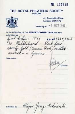 1973 British Explorers 3p Livingstone and Stanley lower righthand corner marginal block of 4 with RPS certificate (1986), 5p Francis Drake gold (Queen's head) omitted, 9p Sturt gold (Queen's head) omitted and 9p Sturt brown-grey printed double, fine unmounted o.g. (7) SG btn 923a/927b