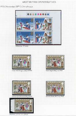 GB: 1973 Christmas displayed on an album leaf including 3½p grey-black (value and inscription) omitted, 3½p blue (leg, robes
