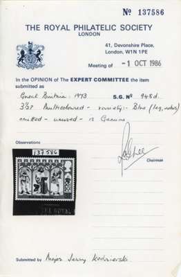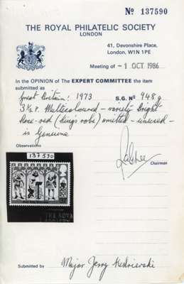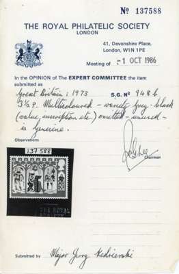 1973 Christmas neatly displayed on an album leaf including 3½p grey-black (value and inscription) omitted, 3½p blue (leg, robes) omitted, 3½p bright rose-red (King's robe) omitted, all with RPS certificates (1986) 3½p salmon-pink omitted plus a dry print showing part salmon-pink omitted, all fine unmounted o.g. SG 984b, 948c, 984d, 948g