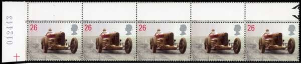 1998 British Land Speed Record Holders 26p top left hand corner marginal horizontal strip of five with rosine (face value) completely omitted from the stamp in column four. unmounted o.g. A spectacular and rare error. SG 2060a cat £2000