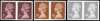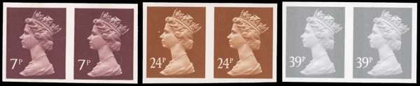 GB: 1977 7p purple-brown (1 centre band), 24p chestnut and 39p grey (2 bands) all horiz imperforate pairs, unmounted o.g.