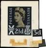 Scotland Regional Definitive: c. 1958 composite essay for the 3d design, hand-painted in black and white with the portrait affixed, on art board (115x139mm), initially with a 2½d denomination, later amended with a flap affixed with tape for a 3d value. Attractive and rare. SG S1var
