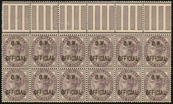 1896 1d Lilac (O.W. Official). Superb unmounted o.g. top interpanneau marginal block of twelve, from positions R.11/5-R.12/10 showing all six overprint settings including two 'Large stop after O' varieties in positions R.10/9 and R.11/9. The largest and without doubt the finest surviving multiple in private hands. Ex DLR archives and Michael Astley collection.