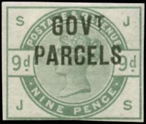 1883 9d Dull green (Govt. Parcels). Very fine and fresh unused o.g. imperforate imprimatur lettered JS. Cut close at foot nevertheless scarce, one of only 29 possible examples. Cat £1700. Ex Michael Astley Collection.