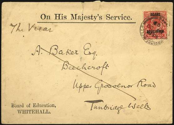 1902 1d Scarlet (Board of Education). Very fine used example on an OHMS Board of Education, Whitehall envelope sent locally within Tunbridge Wells and tied by a Tunbridge Wells cds for NO.20.1903. Some minor soiling nevertheless a very rare departmental cover. Ex Michael Astley Collection.