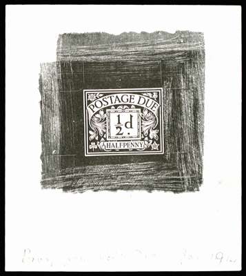 1914 ½d Postage due die proof. Superb uncleared example printed in black on white glazed card (69 x 77mm) with manuscript annotation at foot “Proof from Soft Die Jan 1914“. Rare.