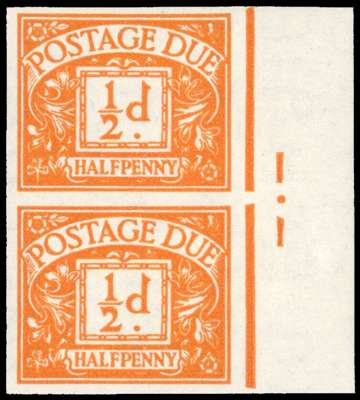 POSTAGE DUE: 1956 ½d orange, right hand marginal vertical pair of imperforate imprimaturs, with ‘BPMA’ h/s on reverse, fine unmounted o.g. scarce. SG D46var