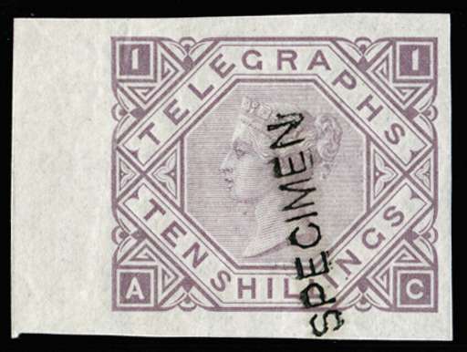 1877 10s "Telegraph" colour trial. Very fine unmounted o.g. left hand marginal imperforate example lettered AC, printed in dull mauve, overprinted "SPECIMEN" type 8.