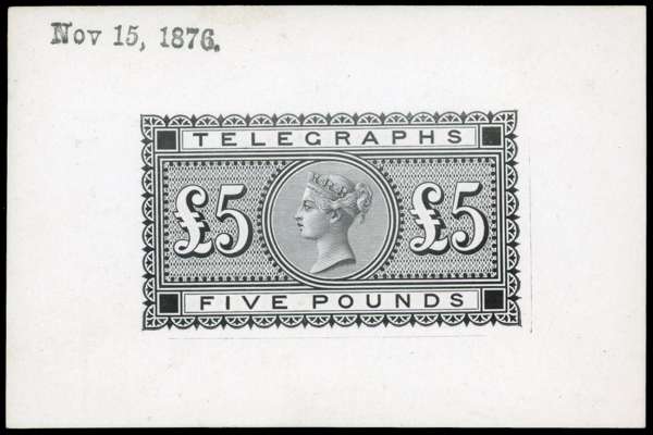 TELEGRAPH: 1876-81 £5 die proof in black on glazed card (91x60mm) without endorsements dated ‘Nov 15,1876.’ fine and scarce. SG T18var