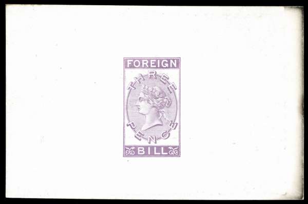 1870 3d Foreign Bill. Very fine die proof printed in lilac on white glazed card (90 x 60mm), produced by DLR for the 1870 Paris Exhibition. Rare.