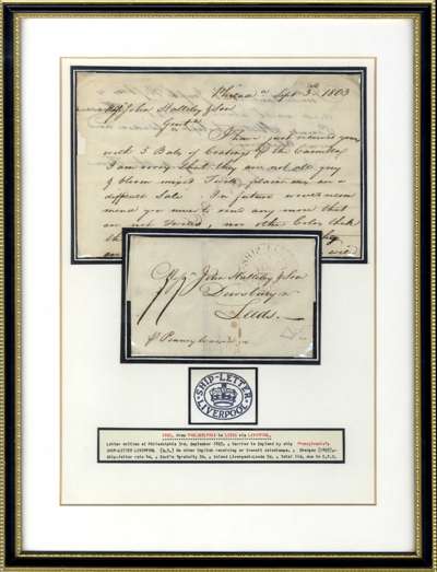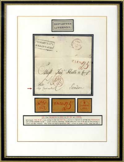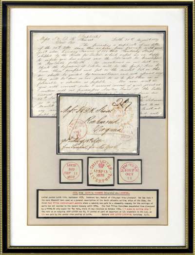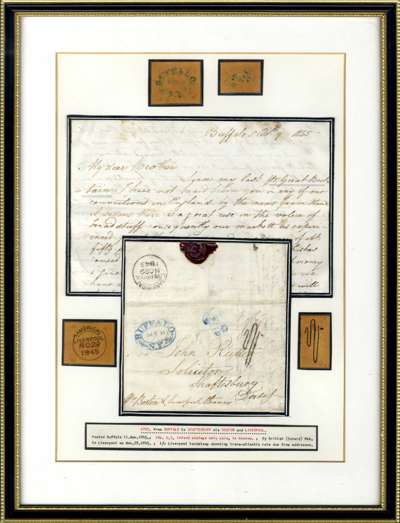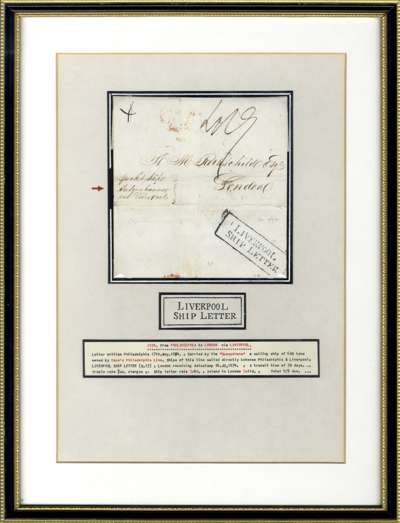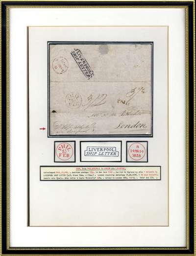 POSTAL HISTORY: 1803-45 selection entire letter postmarked by various types of Liverpool ship letters from the USA superbly mounted and arranged in glass fronted frames, contained in a carton, including 1803 to Leeds (Robertson type S5), 1820 to Chelmsford (S9), 1824 to London (S12), 1828 to London (S9) ,1834 to London (S13) and 1839 from Leith to Richmond (Virginia) (S15a); also 1845 Buffalo (oval marking in blue) to Shaftesbury via Boston and Liverpool (P5). A very interesting group mostly with clear markings. Mostly fine. (7)