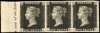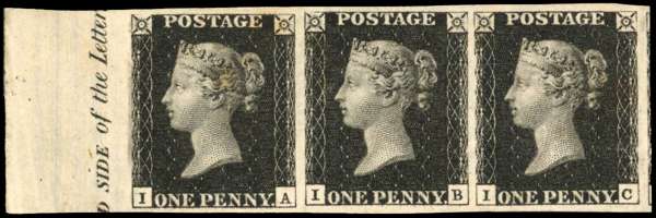 1840 1d Black Pl.5. Exceptionally fine and fresh large four margin lightly mounted unused o.g. left hand marginal horizontal strip of three lettered IA-IC showing part sheet inscription "D SIDE of the Letter". A couple of light, insignificant tone spots not detracting from this magnificent showpiece. BPA cert (1989), SG 2, £47,500++