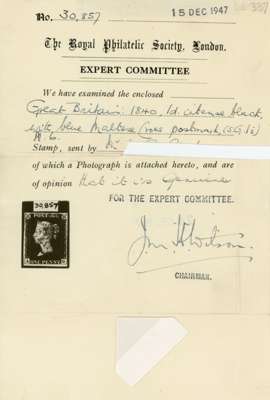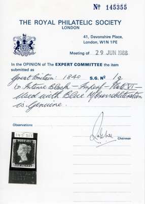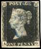 1840 1d intense black Plate 6 (AG) four clear to good margins, neatly tied by crisp blue MC, very fine example with this scarce cancellation. RPSL Certificates (1947 & 1988) SG 1; Spec AS4vc cat £8000 off cover.