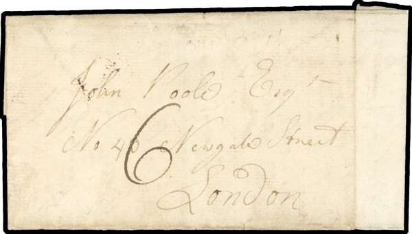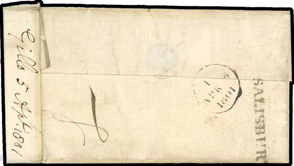 1801 pre-stamp entire sent from Salisbury to London on the first day of the new 1801 (April 5th 1801) postal rates; incorrectly rated ‘6d’, the former rate and not the new 7d rate (80-120 miles, Salisbury is 84 miles). Backstamped by a London arrival for AP.6.1801. Scarce and unusual.