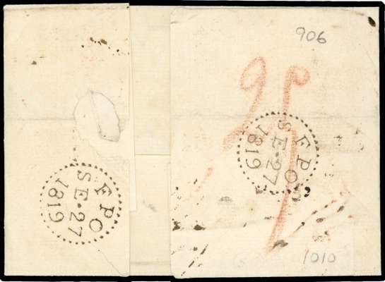 1819 pre-stamp/Incoming Registered Mail. Very fine wrapper sent from Frankfurt to London via Calais bearing a transit datestamp at right for SP 12 1819. two ‘CHARGE’ handstamps and a red ‘REGISTERED' CROWN handstamp (Jay L1127, previously recorded in use between 1820-32 in this colour). Bearing two F.P.O. dotted London datestamps for SE 27 1819 on reverse. Rare cancellation and the earliest recorded example of this Registered handstamp. Ex Willcocks.