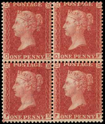 Great Britain 1862 1d Rose red Pl.R16. Very fine unmounted o.g. block of four of this difficult reserve plate lett…
