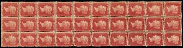 1861 1d Rose red Pl.51 (Alphabet IV). Very fine and fresh unused o.g. block of thirty lettered KJ-TI. A very rare and attractive multiple.