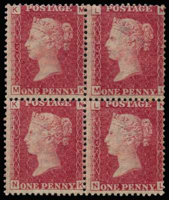 1864 1d Rose red Pl.76 (Wmk reversed). Very fine unused o.g. block of four lettered MK-NL, showing "Error of watermark" on ML. This magnificent reversed watermark variety on ML is only recorded on plates 76 and 84 and thus much rarer than MA which occurs on 22 plates and is currently unpriced in unused condition. Spec. G1c.