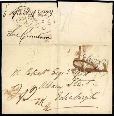 1833 pre-stamp wrapper sent from London to Edinburgh rated at 1/1d struck by an inspector's crown at top right and amended in manuscript 2/2d plus ½d tax at lower left. Showing a magnificent strike of a London dispatch datestamp on reverse for AP 4 1833 with reversed ‘S’ code (Jay L22c) which is only known recorded on this date and is very rare, possibly unique, with an Edinburgh arrival for AP 6 1833 alongside. Filing fold and smudged ink marks but a spectacular cover.