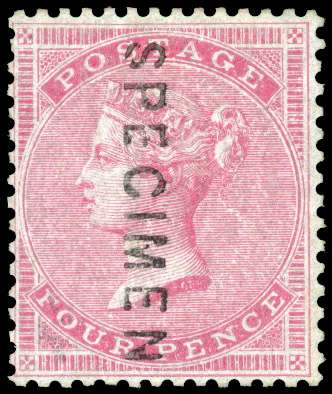 1856 Wmk Medium Garter 4d carmine on thick highly glazed paper, overprinted ‘SPECIMEN’