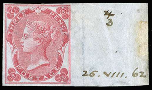 1862 3d Rose Pl.3 (With white dots). Superb unused o.g. right hand marginal imperforate imprimatur endorsed with official manuscript in margin showing the plate number and the date the imprimatur sheet was struck 26.VIII.1862 lettered BL, very rare only 24 possible examples many of which are in institutional collections