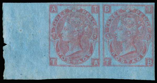 1868 3d Rose Pl.5. Very fine unused o.g. bottom left hand corner marginal imperforate horizontal pair on Dr. Perkins blued paper lettered TA-TB. Ex. Latto. Spec. J30b.