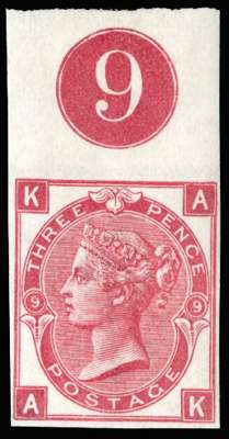 1872 3d Rose Pl.9. Very fine unused o.g. top marginal imperforate imprimatur lettered AK showing plate number. Very rare, unique in private hands. Ex. Crawford, Bates, Beaumont & Latto.