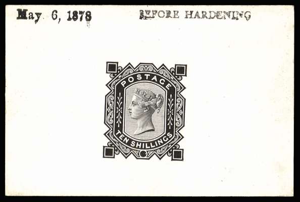 1878 10s Die proof. Very fine example printed in black on white glazed card (91 x 60mm), dated "May 6, 1878" and endorsed "BEFORE HARDENING". Scarce.