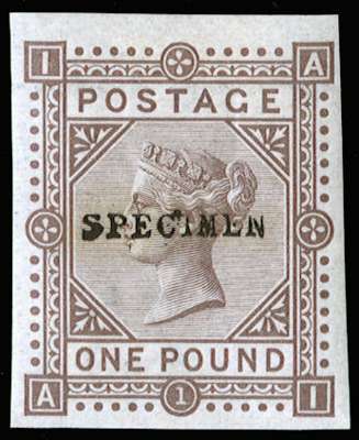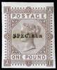 1878 £1 Colour trial Pl.1. Very fine imperforate example lettered AI printed on gummed watermarked paper in brown-lilac, overprinted "SPECIMEN" type 9. Scarce. 1976 RPS Cert.