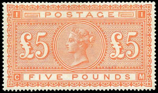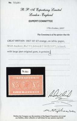 1867-83 £5 orange (CM) large part o.g., fine example with good centring and colour. BPA Certificate (2007) SG 137 £10,000