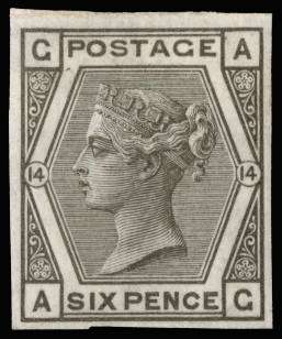 Great Britain 1875 6d Grey Pl.14. Very fine and fresh unused o.g. imperforate imprimatur lettered AG. Very rare, o…