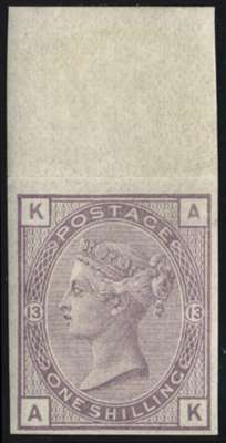 Great Britain 1882 1s Purple Pl.13. Very fine unmounted o.g. top marginal imperforate imprimatur lettered AK. Very…